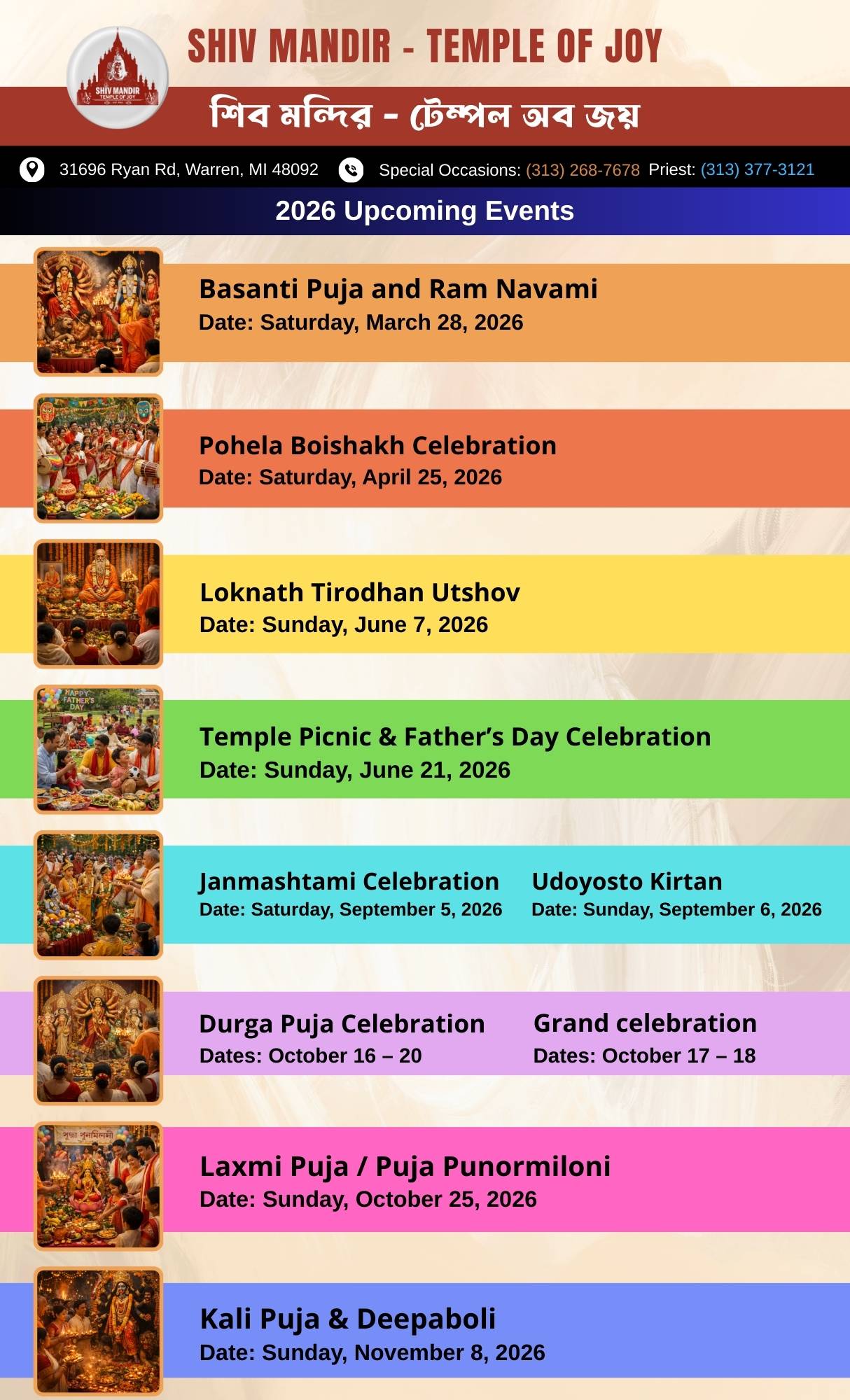 Welcome to the Shiv Mandir, Temple of Joy, a magnificent Hindu Temple that is centrally located in the city of Warren, near Troy, Sterling Heights, and Medison Heights in Michigan, USA. This temple is a common place of worship and cultural activities. We promote a peaceful, harmonious life and the well-being of the community. The Shiv Mandir was founded by famous neurologist and philosopher Dr. Debasish Mridha and his wife, Mrs. Chinu Mridha. Inaugurated on the 27th of September, 2021, this temple will be organized exclusively for charitable, religious, cultural, and philosophical development, as well as educational purposes.